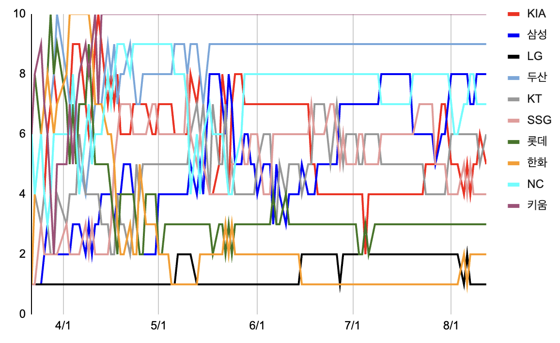 | 6 | KT | 111 | 54 | 53 | 4 | 0.505 | 11.5 | 1패 |