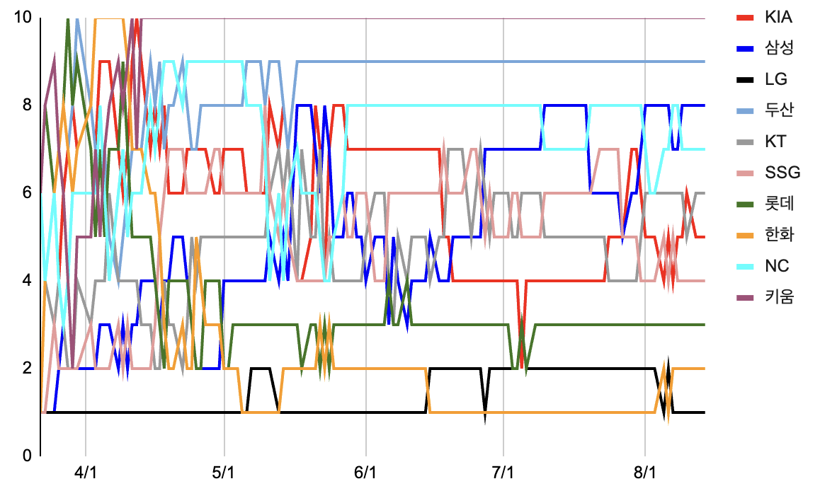 | 8 | 삼성 | 110 | 51 | 58 | 1 | 0.468 | 15.5 | 5패 |