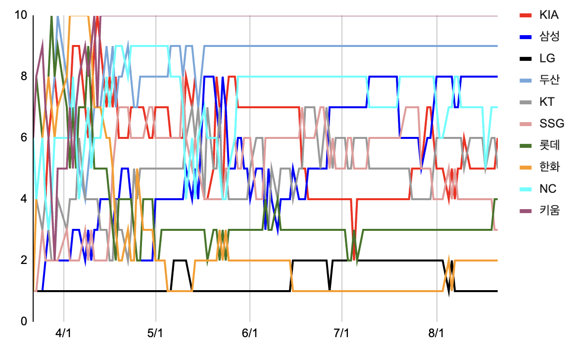 | 8 | 삼성 | 116 | 55 | 59 | 2 | 0.482 | 15.5 | 1패 |