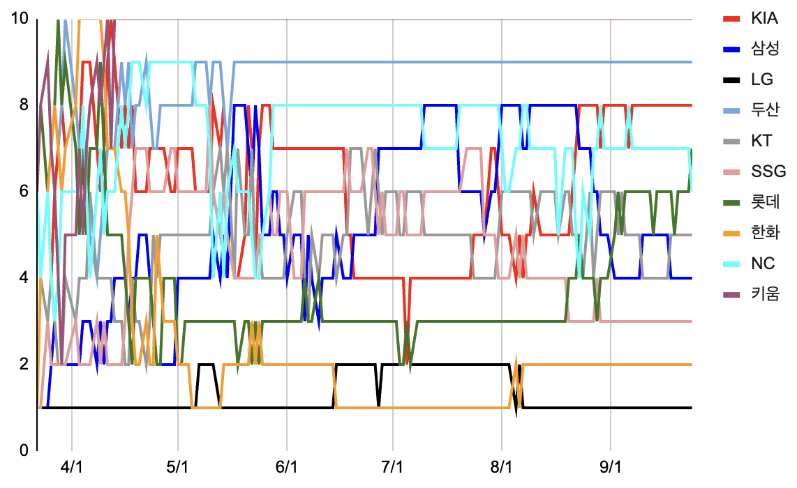 | 4 | 삼성 | 139 | 71 | 66 | 2 | 0.518 | 13 | 2승 |