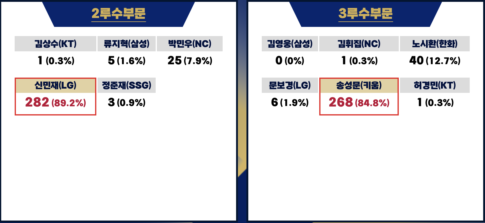 통합우승팀 LG 트윈스 염경엽 감독은 신설된 감독상을 받았고, LG 2루수 신민재도 골든글러브를 품었다. 3루수 부문은 송성문(키움 히어로즈), 유격수 부문은 김주원(NC 다이노스)이 각각 수상했다.