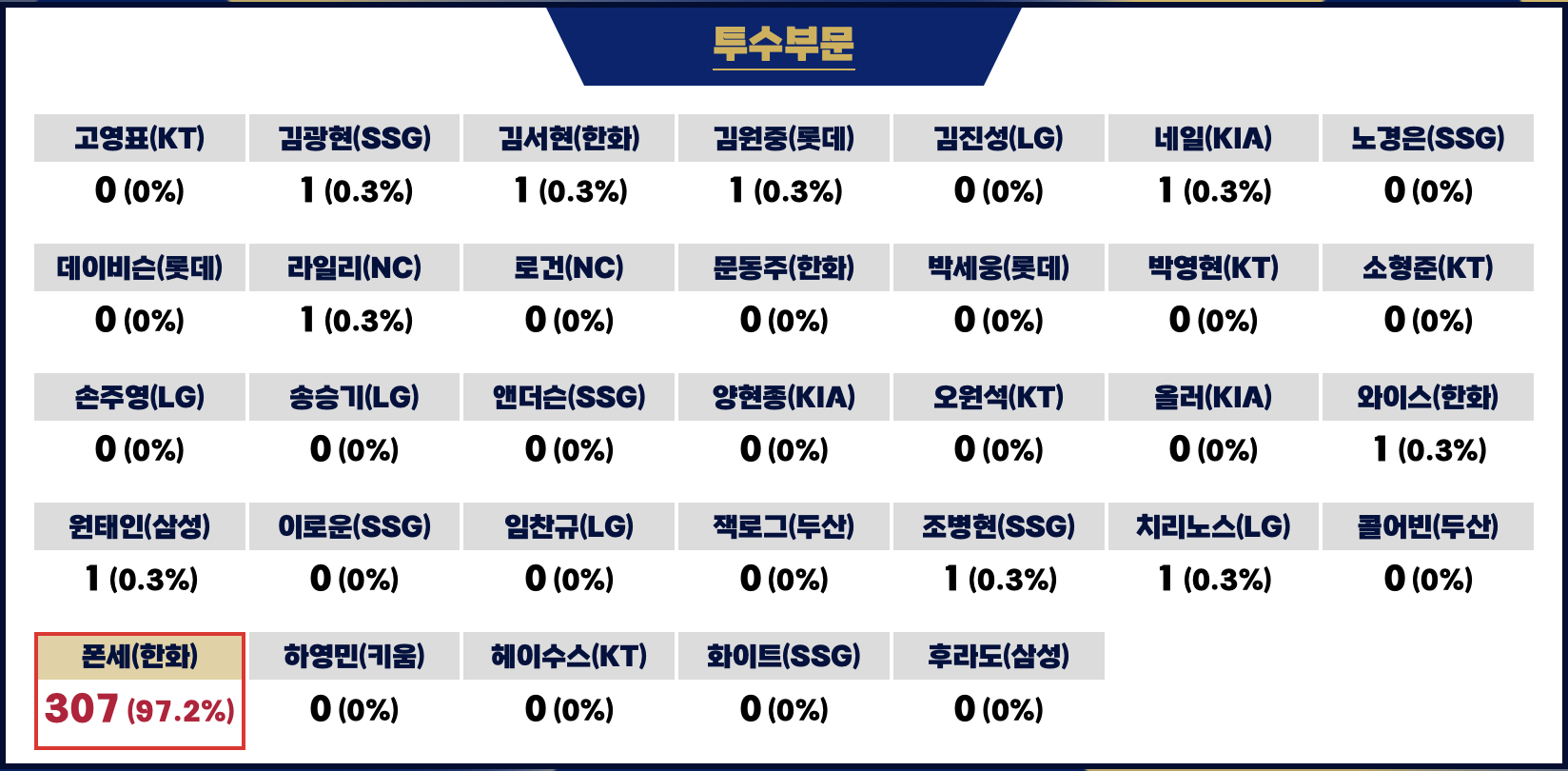 올해 한국 프로야구 KBO리그를 지배하고 미국 프로야구 메이저리그(MLB) 재입성에 성공한 코디 폰세(한화 이글스)가 압도적인 득표율로 ‘황금 장갑’을 거머쥐었다. 정규시즌 최우수선수(MVP)상