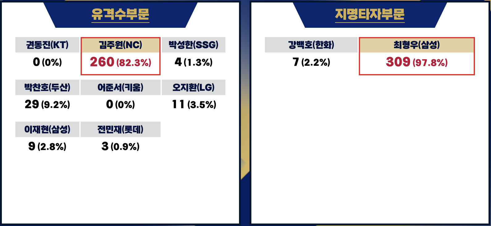 이번 겨울 이적시장에서 KIA 타이거즈를 떠나 9년 만에 친정 삼성 라이온즈로 돌아온 최형우는 지난해에 이어 올해도 지명타자 부문 골든글러브를 받았다. 1983년 12월생인 그는 만 41세 11개월에 이 상을 받으며 지난해 자신이 세운 역대 최고령 수상 기록도 새로 썼다.