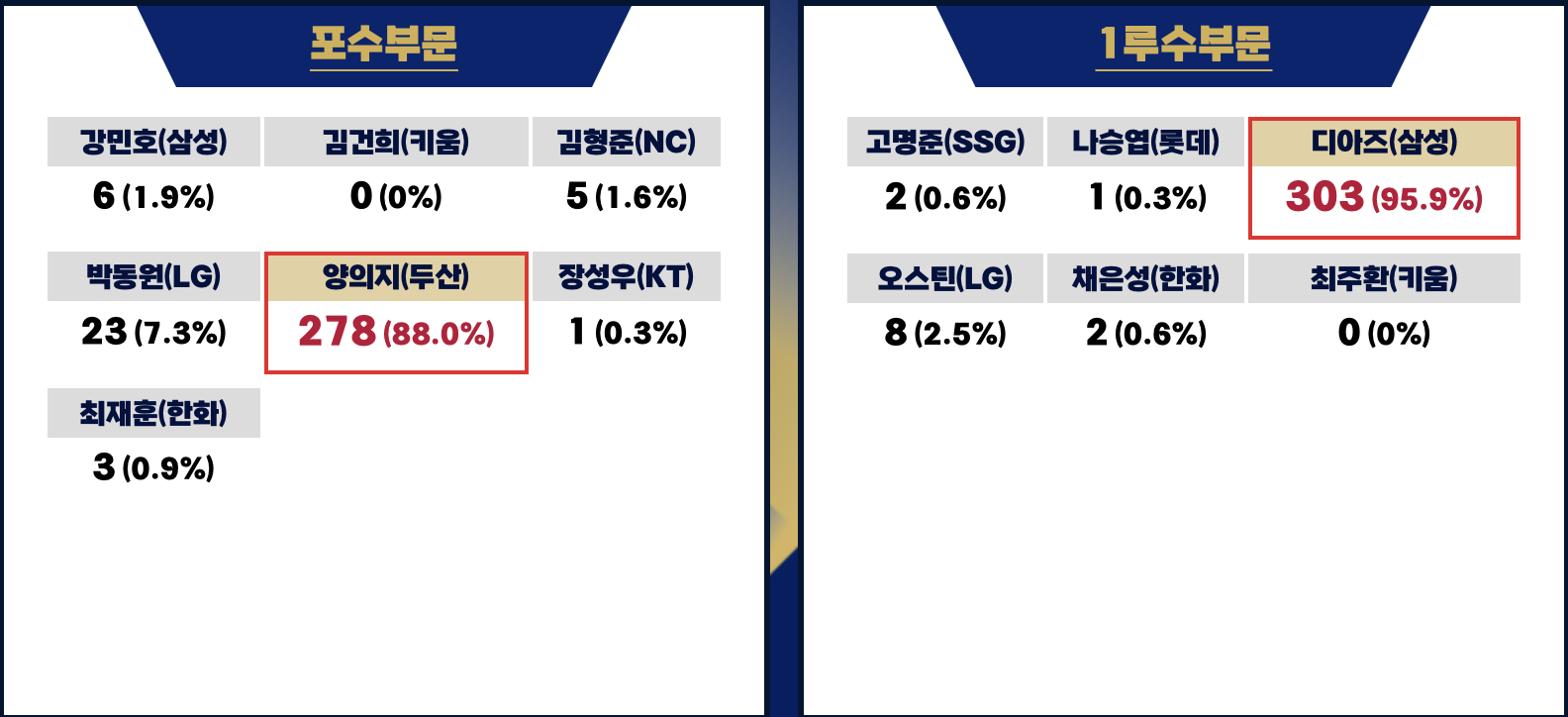 정규 타격왕에 오른 양의지(두산 베어스)는 10번째 황금장갑 수집에 성공하며 종전 최다 수상자인 이승엽 전 두산 감독과 어깨를 나란히 했다. 양의지는 2014~16년, 2018~23년에 이어 올해도 시상식의 주인공이 됐고, 지명타자로 상을 받은 2021년을 제외한 9번은 모두 포수로 수상했다. 그는 올해 정규시즌 130경기에 출전해 타율 0.337, 홈런 20개, 89타점을 기록했다.
